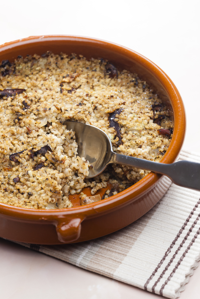 Kroupy i houby namočíme přes noc do vody. Druhý den kroupy uvaříme v osolené vodě doměkka, což bude trvat asi 20 minut. Z hub vymačkáme přebytečnou vodu. Na oleji zpěníme nadrobno pokrájenou cibuli, přidáme houby a krátce podusíme. Nakonec přimícháme kroupy, česnek utřený se solí, pepř a majoránku. Aby se nám spojily chutě, vše důkladně promícháme. Troubu rozpálíme na 170 °C, vymažeme pekáč olejem a dáme do něj směs z pánve. Zapékáme cca 20 minut a ještě horké podáváme.