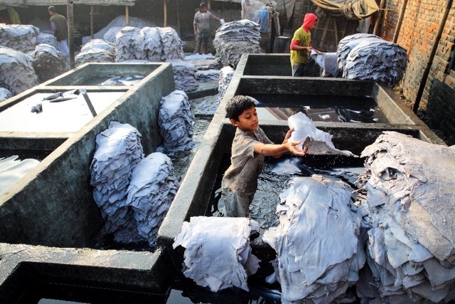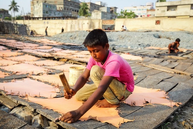 „Přivedl mě sem můj strýc, rodiče s bratrem a sestrou zůstali na vesnici. První měsíc se mi po nich tak stýskalo, že jsem stále plakal. Je to zde děsné. Když jsem sem poprvé přišel, nemohl jsem pořádně dýchat. I voda je tu hrozná. Denně nakolíkuji 150 až 200 kusů kůže. Někdy mi chybí škola. Vychodil jsem tři třídy, ale už nemám žádnou šanci se k učení vrátit. Vydělávám 6000 taka (75 dolarů) každý měsíc, můj otec na vesnici takové peníze nevydělá. Peníze, které rodině na vesnici posílám, pomáhají mým sourozencům ve vzdělání. Jsem rád, že aspoň moje sestra a bratr mohou chodit do školy,“ vypráví svůj smutný příběh třináctiletý Shakil z bangladéšské koželužny.