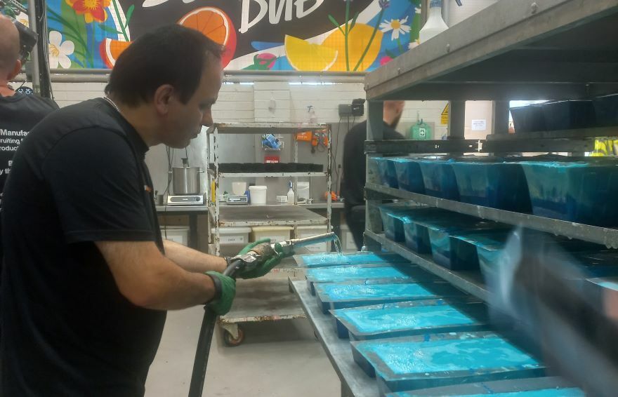 Dále sledujeme (opět ruční) proces nalévání směsí do připravených plastových „pekáčů“, tedy mýdlových forem. „Co se týká forem, snažíme se je využít, co nejvíce to jde. Většinou každou použijeme dvakrát až třikrát, než začne praskat a lámat se,“ vysvětluje Annabel. „Taková forma se potom recykluje v našem Green Hubu, což je oddělení k tomu určené.“