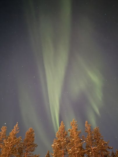 Ve finské mytologii se o polární záři mluví jako o ohnivé lišce (revontulet). Podle pověstí běžela liška přes zasněžené pláně, její ocas se třel o mrazivý sníh a to, co vidíme na obloze, jsou vlastně jiskry, které přitom vznikly. To jsou ty klasické zářivé tvary, nad kterými se tají dech a které vidíte buď kamerou objektivu (obyčejný mobil s nočním režimem v pohodě stačí), nebo se za nimi vypravíte na sobích spřeženích do míst, kde nesvítí vůbec nic. Lidské oko totiž vnímá ve tmě více intenzitu světla než jeho barvu, proto pak dlouhá expozice s dobrým objektivem odhalí a zdůrazní magickou krásu i v osvětlených oblastech, což byl i náš případ.