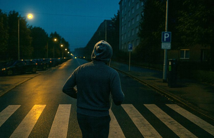 To jsem byl zrovna na přechodu. Ale přede mnou, asi tři metry, byla slečna. Nevím, jak vypadala. Jen vím, že měla džíny a dlouhé tmavé vlasy. Všiml jsem si jí až na poslední chvíli, vlastně až tehdy, když jsem vyrazil sprintem vpřed. A jelikož jsme byli na přechodu, tak přímo za ní. Otočila se, ubezpečila se, že se jí to nezdálo, že někdo opravdu vyrazil z relativní blízkosti směrem k ní. Kdoví, co jí v tu chvíli blesklo hlavou, ale udělala to jediné, co mohla udělat, když se za vámi ve tmě rozběhne stodevadesáticentimetrový chlap. Otočila se a utíkala pryč, dvakrát tak rychle jako já.