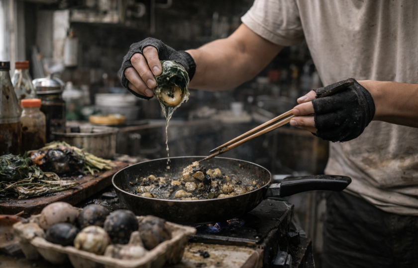 Existuje nespočet způsobů, jak uvařit vejce. Haritsu dává přednost tomu, který začíná v okamžiku, kdy by většina z nás zavolala deratizéra. Slimákovitá skořápka, černozelený vnitřek, nezaměnitelný zápach. Vejce rozklepne, vyloví černé cosi, co bývalo žloutkem, omyje to mýdlem, osmaží se starou zeleninou a podává bez ironie.