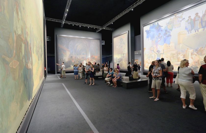 Ve výstavním prostoru je poměrně chladno. Přenosné klimatizace chladí pavilon na osmnáct stupňů, přesně na teplotu, kterou vzácná díla potřebují. Centrální část pavilonu zabírá devět největších pláten Slovanské epopeje. Aby si návštěvník prohlédl celý výjev, musí zaklonit hlavu. Mucha ve svém mistrovském díle zobrazil výjevy do nejmenších podrobností, je vidět výraz každé z desítek tváří na plátnech, vidíte i jednotlivá stébla trávy.