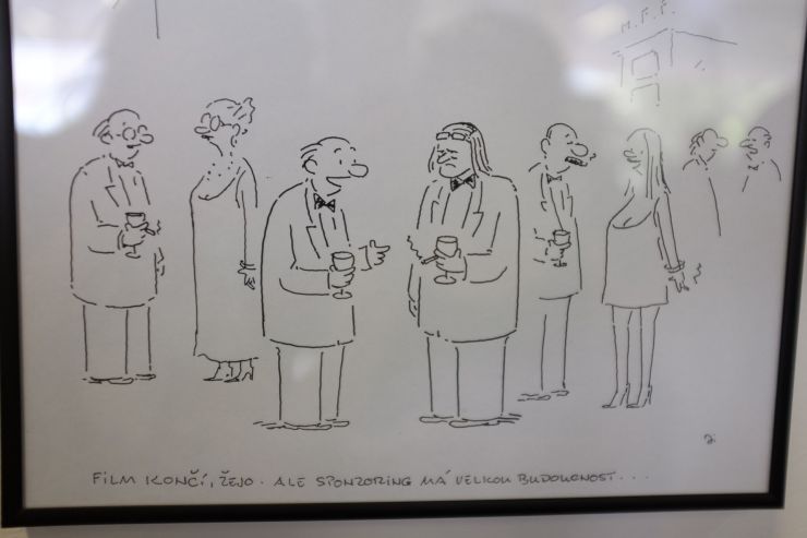 Vzpomínku na tohoto geniálního kreslíře a ilustrátora přidal i prezident festivalu Jiří Bartoška (ten pán s dlouhými vlasy, cigárem a vínem v ruce) a fór „Film končí, co? Ale sponzoring má velkou budoucnost …“ ohodnotil vzhledem k událostem, které provázely letošní ročník, jako velmi aktuální a trefný. Unikátní výstavu k nedožitým 80. narozeninám tohoto geniálního kreslíře a humoristy najdete v hotelu Thermal, v prvním patře u terasy. Vřele doporučujeme.
