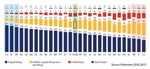 Většina respondentů ve všech 28 členských státech věří tomu, že jejich země má z členství v EU prospěch. Od posledního průzkumu v dubnu 2018 se toto číslo zvýšilo o jeden procentní bod na současných 68 %, což je mimochodem nejvyšší údaj od roku 1983. Nejužitečnější jsou podle respondentů ekonomické benefity spolu s přesvědčením, že EU pomůže udržet dobré a bezpečné vztahy s ostatními zeměmi.