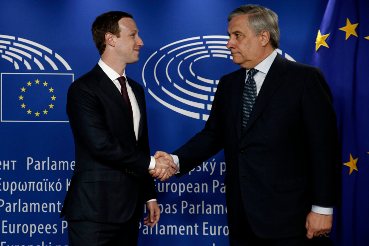 Mark Zuckerberg, šéf Facebooku, a Antonio Tajani, šéf Evropského parlamentu, si podali ruce v květnu 2018 v budově EP. Výrazy jejich tváří jsou vypovídající