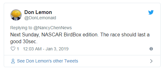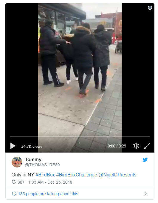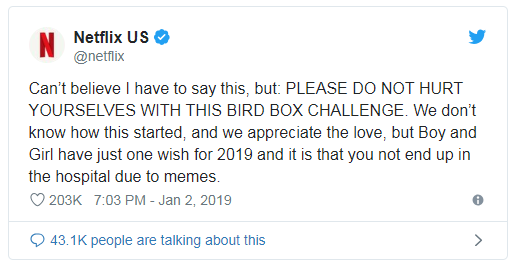 „Nemůžu uvěřit, že to musím říkat, ale: PROSÍM NEZRAŇTE SE PŘI BIRD BOX CHALLENGE. Nemáme ponětí, jak to začalo, a velice si vaší přízně vážíme, ale Boy a Girl mají do roku 2019 jedno velké přání: abyste kvůli nim neskončili v nemocnici.“