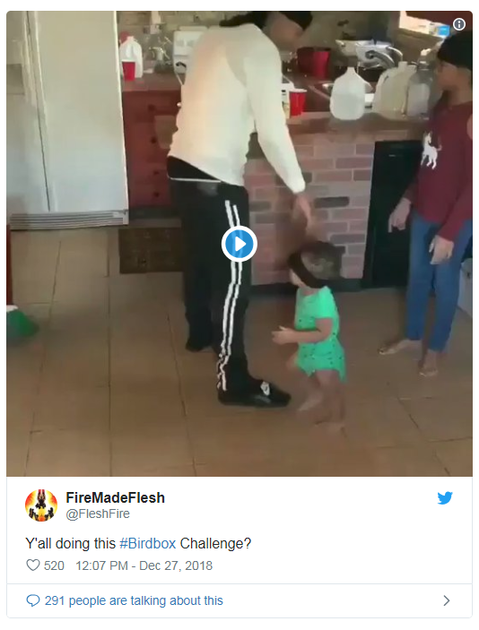 Bird Box challenge funguje na identickém principu. Módní socnetová vlna ale o několik levelů překonává všechna ta vylívání studené vody na hlavu, konzumaci skořice nebo polykání tablet do pračky. V nejnovější výzvě se lidé pokoušejí napodobit děj filmu: z místa A do místa B se přesuňte se zavázanýma očima, případně zkuste s páskou přes oči zkusit dělat naprosto běžné věci – a samozřejmě se u toho natočte a sdílejte video na sociálních sítích. Pro sledovanost a lajky jsou ovšem lidé schopni udělat naprosto šílené věci. V jednom z videí pobíhá tříčlenná rodina se zavázanýma očima po bytě, až se nejmladší dítě praští do hlavy. Na jiném videu si zase řidič přetáhne přes oči pletenou čepici a řídí poslepu. Situace dospěla až do takové fáze, že Netflix sám varuje: Neopičte se po našem filmu, můžete skončit v nemocnici.