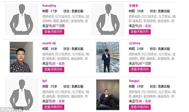 Taobao, největší online prodejce v Číně, má pro falešného přítele a přítelkyni samostatnou sekci. Byznys prosperuje již několik let a poptávka po těchto službách kvůli velkému počtu čínských svobodných ve věku kolem třiceti let vzrůstá. Printscreen zobrazený níže je ze seznamky Piaoliang a nabízí k pronájmu muže: