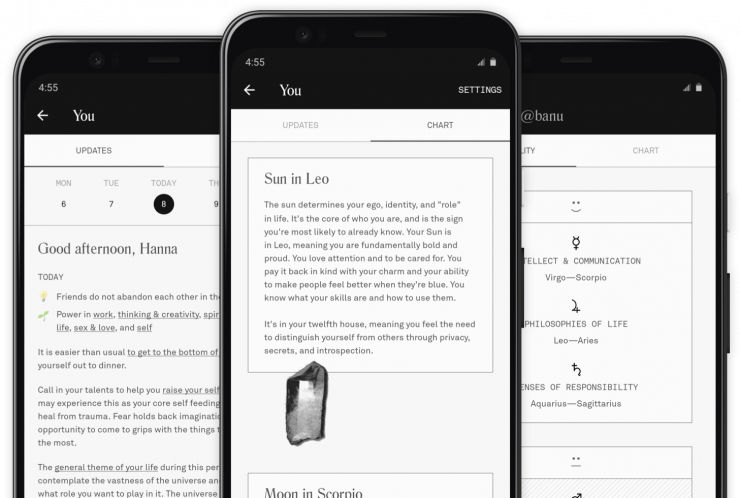 Několik investorů, kteří do vývoje appky Co-star vrazilo asi šest milionů dolarů, si přinejmenším mne ruce, neboť letošek slibuje slušný výdělek. Aplikace jde na dračku. Miliony mileniálů ji každý den kontrolují stejně často jako callory counter nebo step counter (počítadlo kalorií a kroků), pakliže ne častěji. Aplikace funguje jednoduše. Zadáte rok, měsíc, den, hodinu a místo narození, appka v minutě spočítá rozestavení planet, hvězd i energie Země a pošle “snímek oblohy”, jak ji mohla zachytit vaše očka první minutu na tomto světě, kdyby vás tenkrát něco takového napadlo.