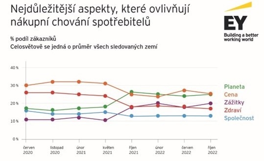 Aktuální data z globálního průzkumu ukazují, že spotřebitelé nakupují podle zhruba dvou stejně důležitých priorit: cenové dostupnosti (25 %) a ekologičnosti (25 %). Ovšem v zemích s vysokou inflací, mezi které se letos zařadilo i Česko, se cenová dostupnost stala v roce 2022 hlavním kritériem pro nákupní rozhodování u podstatné skupiny spotřebitelů,“ uvedl Jan Fanta, vedoucí partner oddělení Consultingu EY Česká republika. „V mnoha ohledech jde šetrnost ruku v ruce s ohledem na životní prostředí a zde je šance, že aktuální inflační vlna může pomoci spotřebitelům vytvořit si dlouhodobě udržitelnější návyky,“ dodává.