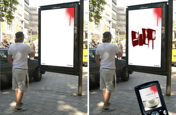 V německé kampani od Design Factory International vznikla pro streetovou značku oblečení Ecko Unlimited kampaň Bluetooth Graffiti, ve které se lidé mohli za pomocí bluetooth připojit k reklamnímu nosiči na autobusové zastávce. Všechno, co pak ve zobrazeném rozhraní na svém mobilu namalovali, se rovnou objevilo na obrazovce před nimi. Zcela legálně. Dobrá inspirace pro Prahu: Nedávno se totiž v Praze konal happening, který měl upozornit na nedostatek veřejných ploch, které by si umělci mohli legálně posprejovat