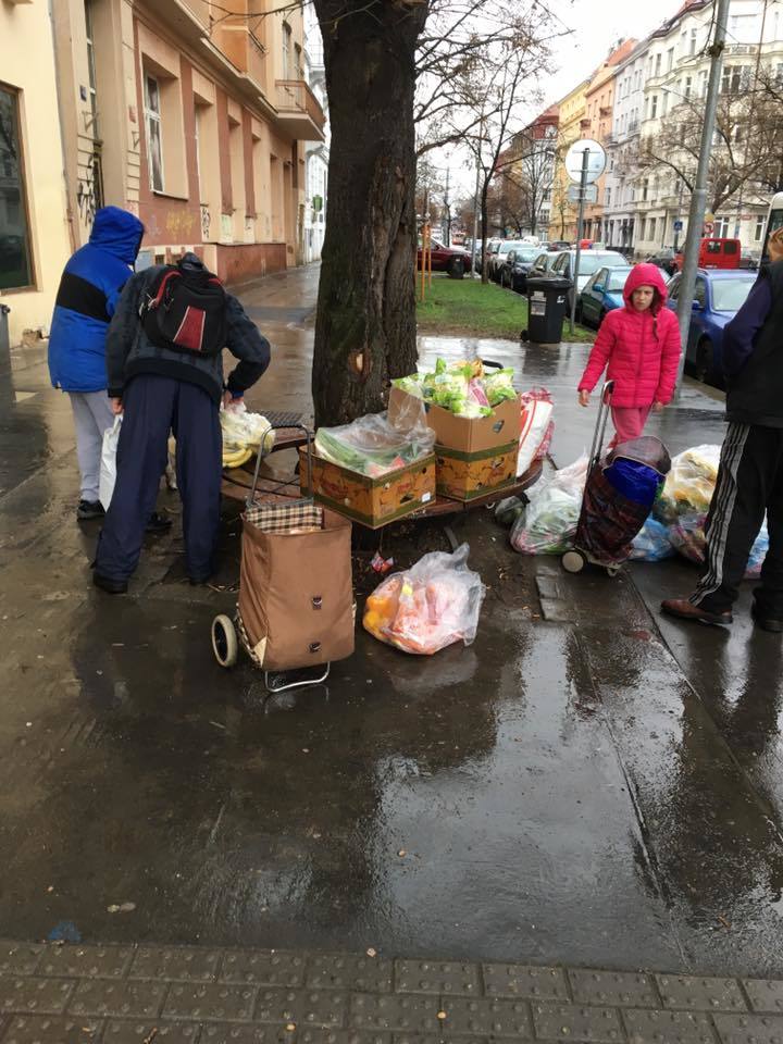 „Ne, to jsem sem dal já. Já v Tesku uklízím a přemluvil jsem je, aby to nevyhazovali. Za chvilku přijedou z Charity, ale naberte si, co potřebujete.“