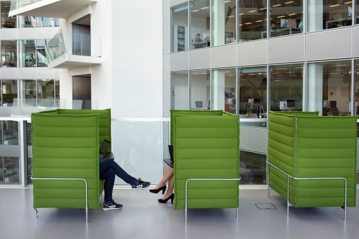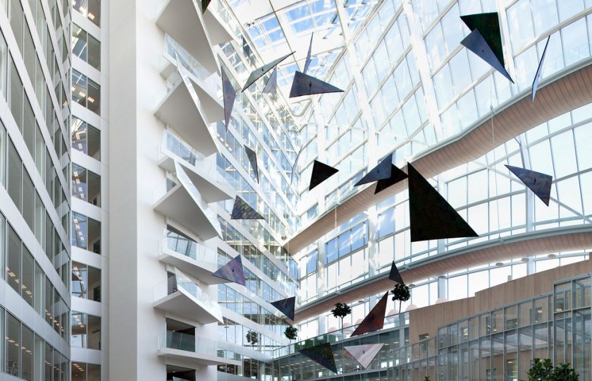 Atrium se svou ikonickou šikmou střechou, která zvenku vypadá, jako by byl z budovy kousek vyříznut, zaplavuje pracovní prostory denním světlem a poskytuje zvukovou ochranu před hlukem z nedalekých železnic a dálnic. Žádný z pracovních prostor není od okna dál než sedm metrů. „Celou čtvrtinu prostor budovy tvoří místa k setkávání,“ říká Ron Bakker, architekt stavby z londýnské kanceláře PLP Architecture. „Zjistili jsme, že kancelářský prostor není ani tak postaven na pracovních místech jako spíš na budování komunity, tedy o vytvoření místa, kam lidé chtějí chodit, kde jsou rozvíjeny nápady a určována budoucnost.“
