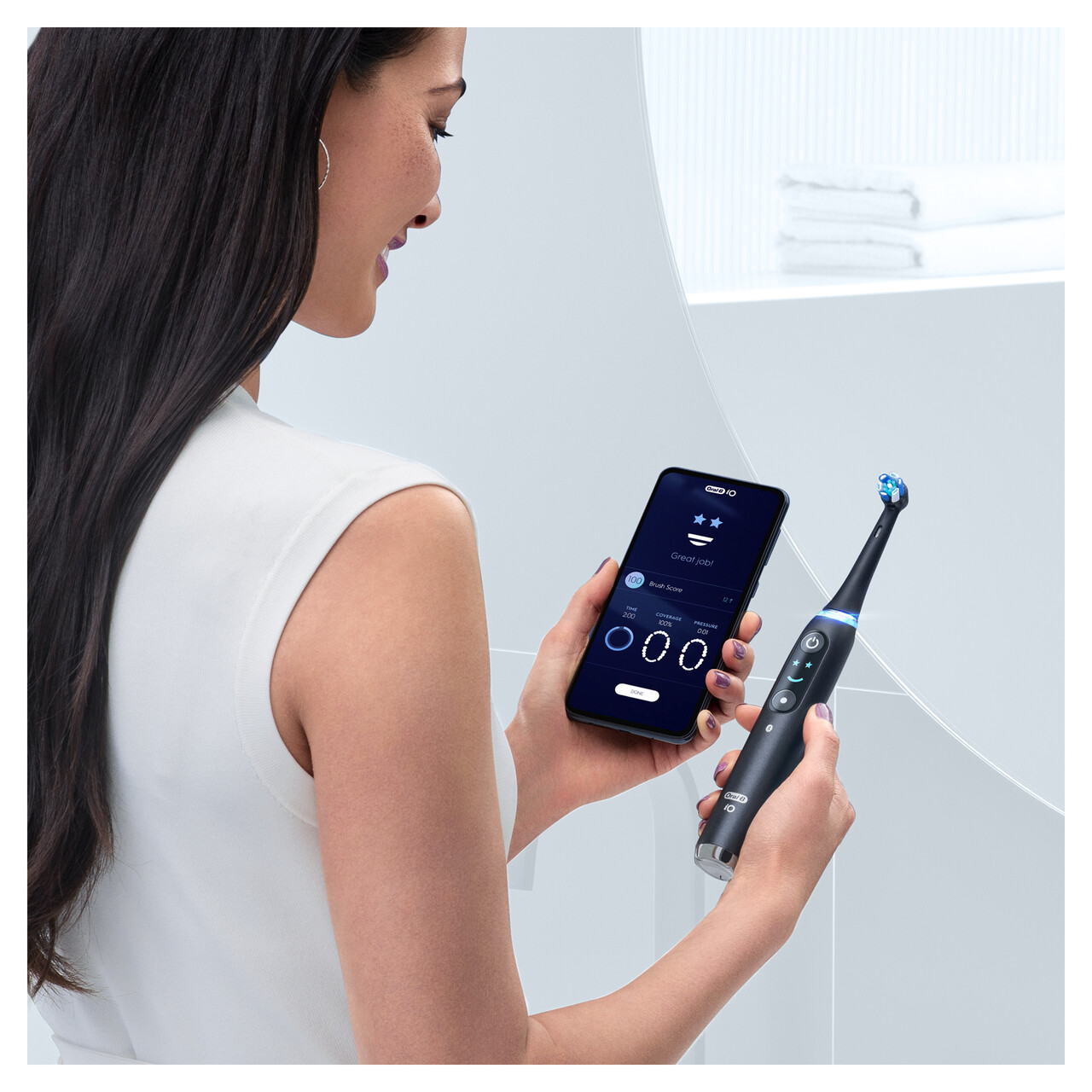 S kartáčkem Oral-B iO se vám navíc nestane, že byste na kartáček zbytečně tlačili. Má totiž zabudovaný světelný kroužek, který při čištění svítí třemi barvami – červeně, pokud tlačíte moc, zeleně, když vyvíjíte optimální tlak a přednastavenou barvou, když je tlak příliš nízký. Velkou výhodou je také mobilní aplikace, ve které najdete 3D grafiku a technologii AI Brushing Recognition s umělou inteligencí.