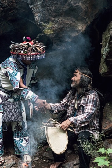 Šedesátník Hivshu z Grónska a padesátník Otakame z Mexika se poprvé potkali na Setkání třinácti šamanů v sibiřské Tuvě v roce 2015. Později přijali pozvání do Čech v rámci projektu Cesta Předků a při té příležitosti jsme s nimi mohli mluvit a v pražské Šárce udělat pár snímků, když spolu pánové mocně zpívali a tančili.