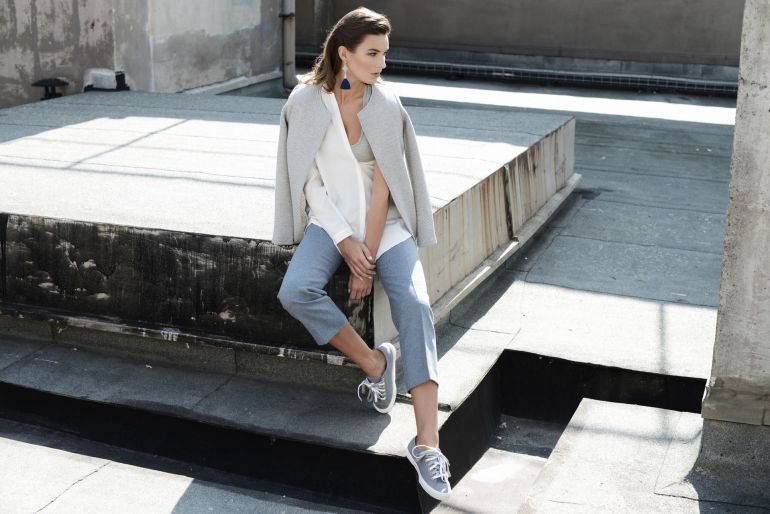 Náušnice 2600 Kč, Mokobelle, Vana1, podprsenka 899 Kč, Calvin Klein, Van Graaf, kabátek 1099 Kč, Vila, Van Graaf, bílá košile 1499 Kč, Marie Lund, Van Graaf, Kalhoty, cena na vyžádání, COS, tenisky z konopí 1600 Kč, Bohempia.eu