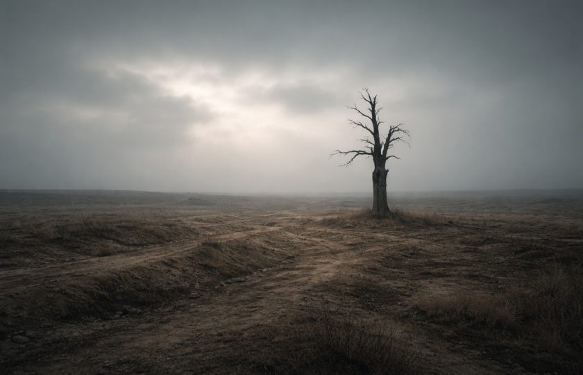 Ticho má někdy silnější výpověď než slova. Prázdná krajina s jemnými jizvami v zemi a jediný poškozený strom připomínají křehkost světa, který považujeme za samozřejmý. Nejde o katastrofu, ale o chvíli k zastavení.