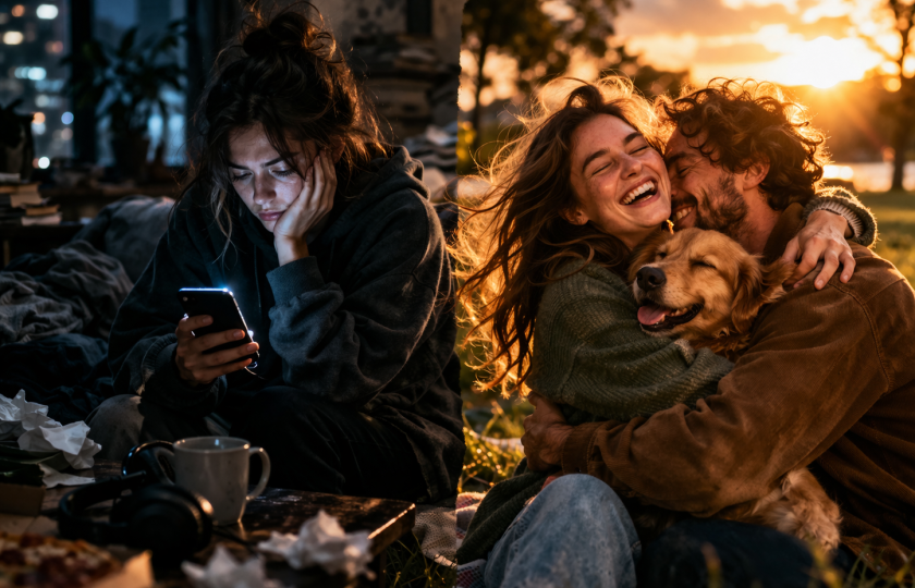 Zato oxytocin, to je jiný případ. Látka, která způsobuje, že cítíme ten pocit jsme dva, na všechno dva, na lásku a na život, dva. A potřebujeme někoho obejmout, s někým se smát a držet se za ruce dýl než dvacet vteřin. Ale pozor: oxytocin není o lajcích a srdíčkách pod příspěvky na sociálních sítích. Oxytocin je brutálně reálný. Potřebuje smích, dotek, skutečný kontakt, který se nedá odscrollovat. Ten moment, kdy jste dva proti světu. Nebo jen dva vedle sebe a svět je na chvíli jedno.