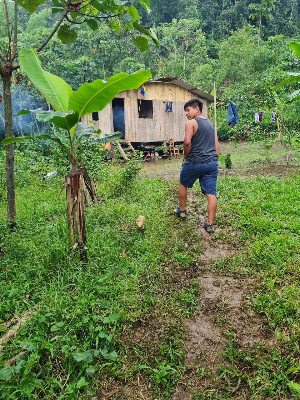 V tradičním obydlí, kterému se říká cabaña. Je to taková chýše, nebo spíš přístřešek s dřevěnou podlahou a střechou z listí a klestí. Mám tady svoje soukromí, ale všichni jsme blízko sebe. Je tady celkem 6 rodin jen pár minut od sebe. Celá komunita má dohromady okolo 50 členů.