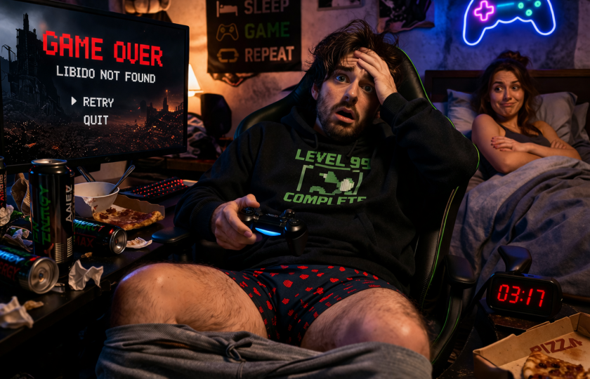 No, a teď si k tomu přidejte životní styl hardcore gamerů. Chodí spát nad ránem, živí se pizzou a energy drinky a o tělocviku slyšeli naposledy na základní škole. Jenže tělo není samoobsluha, kde má všechno své pevně stanovené ceny. Když je unavené, začíná prioritizovat. Dýchat člověk musí, jinak by umřel. Což o sexu neplatí, takže erekce? Až na to bude vhodnější čas. A to může být za hodně dlouho.
