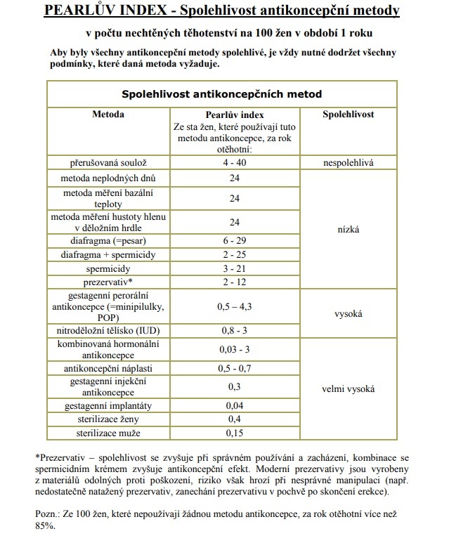 Pearlův index vyjadřuje spolehlivost jednotlivých antikoncepčních metod. Udává počet těhotenství u 100 typických párů užívajících danou antikoncepci v průběhu jednoho roku. (zdroj: IKEM)